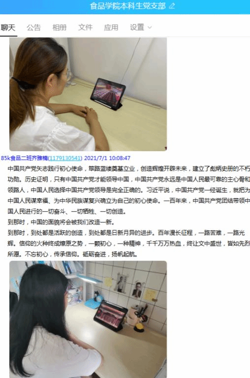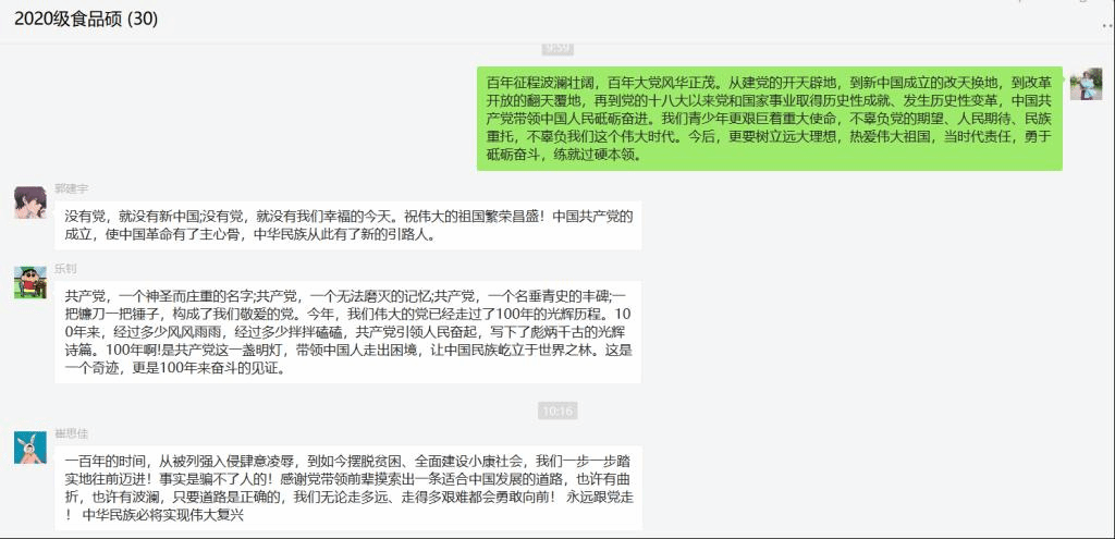 公司研究生、本科生自行观看并利用微信群、QQ群进行线上集中讨论。研究生们表示,“做为新时代研究生,大家都深知身上肩负的青年重任,心中有信仰,脚下有力量,全体研究生将把对马克思主义的信仰、对中国特色社会主义的信念作为毕生追求,永远信党爱党为党,在各自专业刻苦钻研,顽强拼搏,不断把为崇高理想奋斗的实践推向前进”。本科员工们也纷纷表示,“要继承光荣传统、赓续红色血脉,永远把伟大建党精神继承下去、发扬光大,为中华民族伟大复兴贡献自己的青春力量”!
