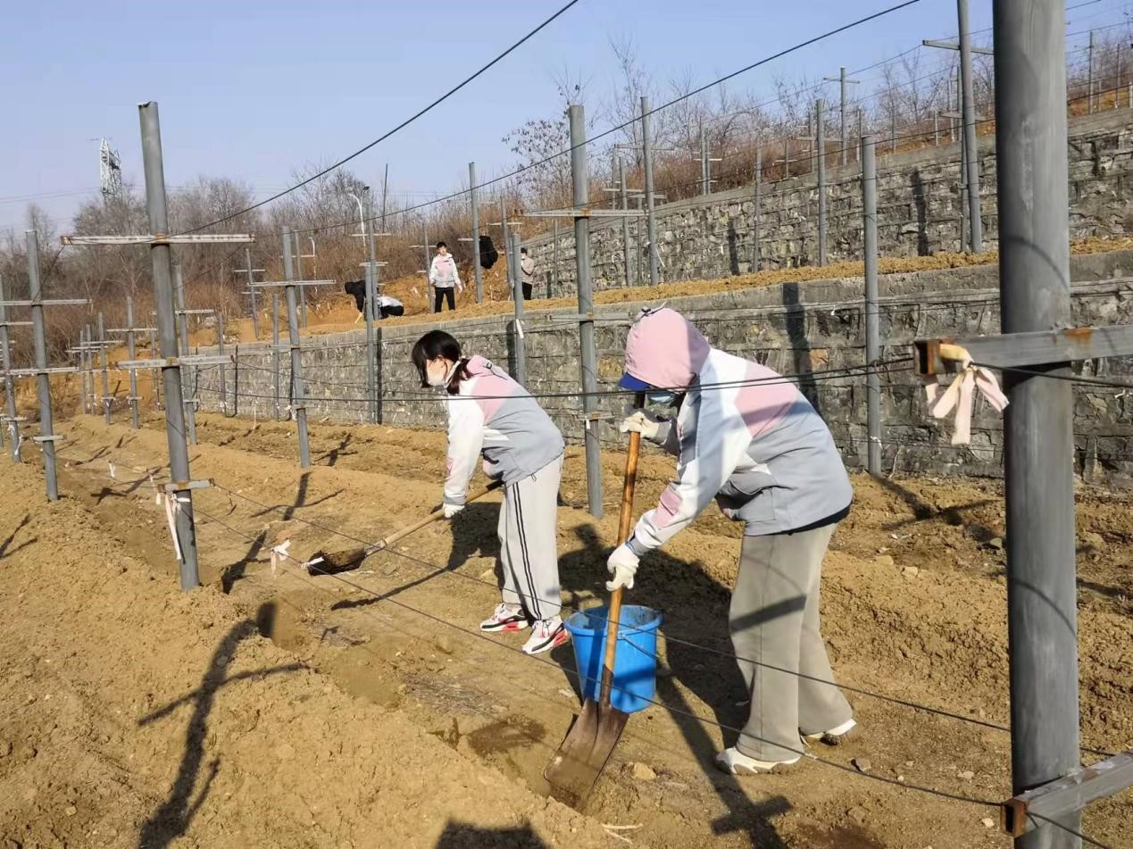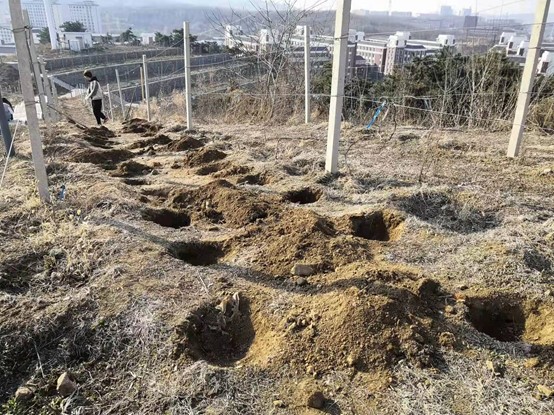 结合葡萄物候期节点,本次劳动的主要内容为农家肥的施用和威代尔葡萄树的出土上架。指导教师郑崴根据参加劳动的员工数量,结合葡萄园中各地块的差异,让同学们优先在葡萄园水肥条件最差的区域开展劳动,实现精准作业。同学们被分为三个小组,每组的工作区域和任务量均经过严谨的空间测算,既保证了劳动内容的充实,也确保了劳动任务可以顺利完成。为了使肥料得到最大限度的利用,同学们不辞辛苦,深挖施肥坑,确保肥料深施。过程中,个别同学甚至磨破了手指。尽管如此,同学们依旧毫无怨言。威代尔葡萄抗寒性差,冬季都被埋在地下以防冻害。同学们需先后移去覆土和防寒被,再将葡萄主干绑缚上铁线,整个过程颇为费力。可喜的是,在各组同学的通力合作下,此项工作均顺利完成,避免了威代尔葡萄在地下发芽的不良后果。