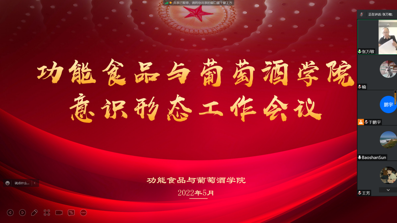 张万敏在会上强调,2022年是进入全面建设社会主义现代化国家、向第二个百年奋斗目标奋勇前进的重要一年,做好意识形态工作意义重大,全体师生要保持高度政治清醒和政治定力,全力做好疫情防控新形势下的意识形态工作,他要求:一要强化政治意识,落实意识形态工作责任;二要加强各类意识形态阵地管理,积极弘扬主旋律传播正能量;三要扎实有效开展意识形态工作研判分析,提高意识形态工作的主动性和针对性。