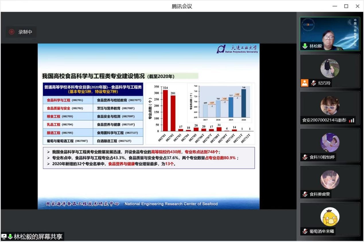 为了提高员工们的专业自信,扩展专业教师的知识领域,5月23日下午,太阳成集团tyc122ccvip邀请大连工业大学研究生院经理林松毅教授,利用腾讯会议做关于“食品科学与工程类本科生创新能力培养”的讲座。公司领导、部分专业教师和2020级全体本科生参会,会议由教学副经理韩静主持。