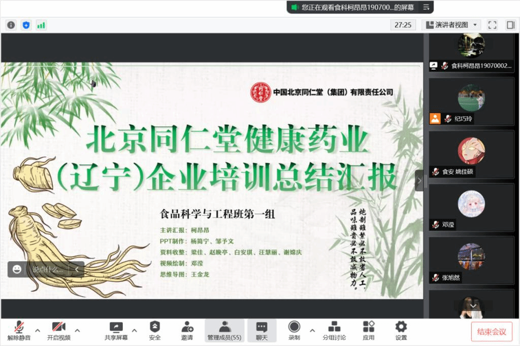 教学副经理韩静做生产实习动员,强调实习的目的、意义、对指导教师和员工的要求等。为了拓宽员工的眼界,提高员工综合素养,提升员工对未来职业的深入理解和认同,特邀请天士力研究院保健食品开发中心所长徐咏全,做关于“保健食品研发、注册及案例分享”的讲座。本次实习邀请了校外实践基地北京同仁堂健康药业(辽宁)有限公司和本溪木兰花乳业有限责任公司进行线上讲解;首次与辽宁省食品检验检测院进行生产实习合作。