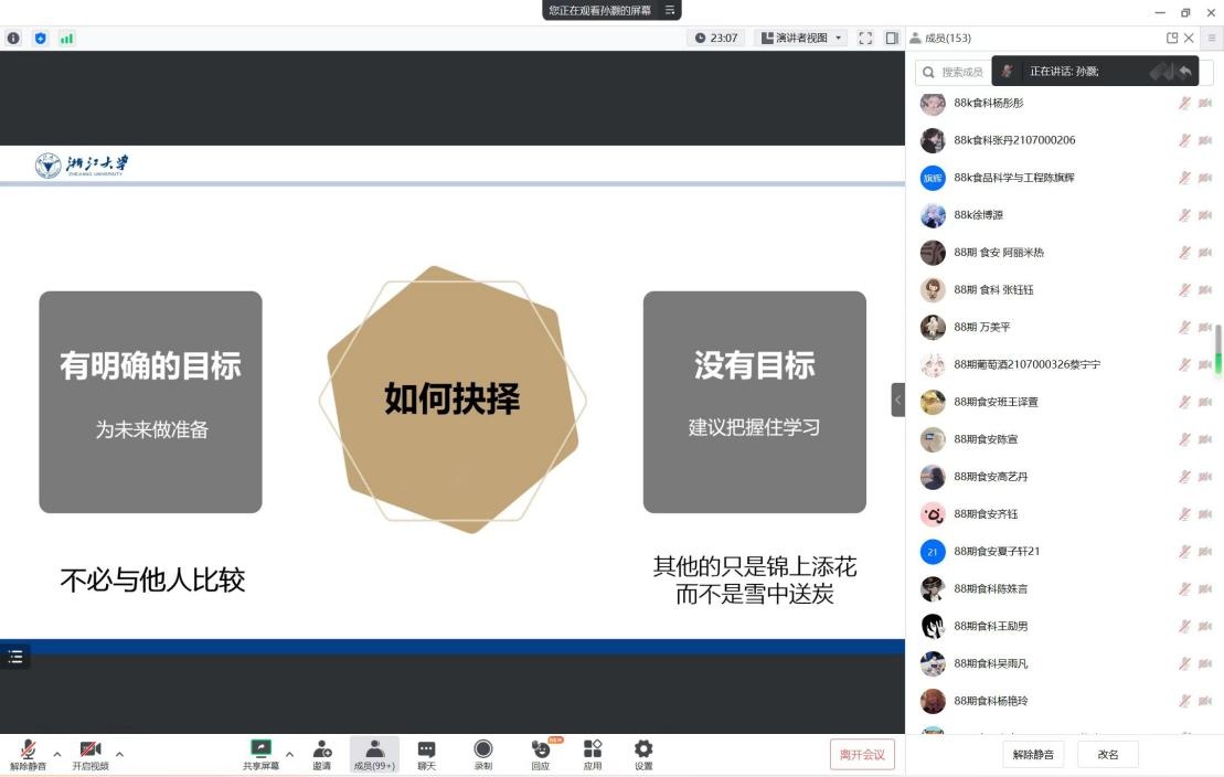 孙灏以自己的大学经历以及在浙江大学求学期间的收获为重点,与同学们分享了他在葡萄与葡萄酒工程专业两年学习期间丰富的员工活动经历,转专业至药学(理科基地班)后学习重心的转变和心态的调整以及目前在浙江大学研究生学习两年期间的收获和感悟,从老员工活的规划、专业学习与员工活动间的平衡、免试推荐公司的选择和准备以及个人成长和发展等方面给同学们传授了很多宝贵的经验。听了学长的分享,同学们纷纷表示,非常钦佩学长热爱生活、勇于挑战的态度,对如何科学管理时间以及合理规划老员工活有了更深的思考和认识。