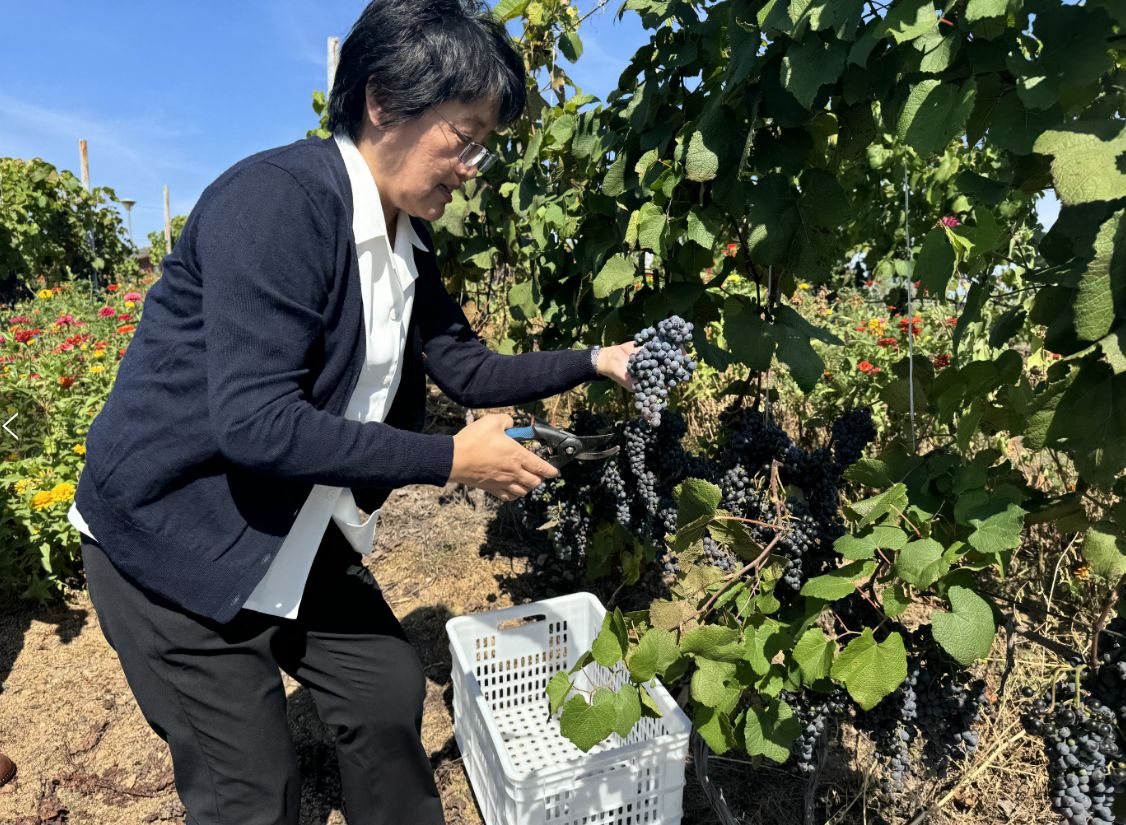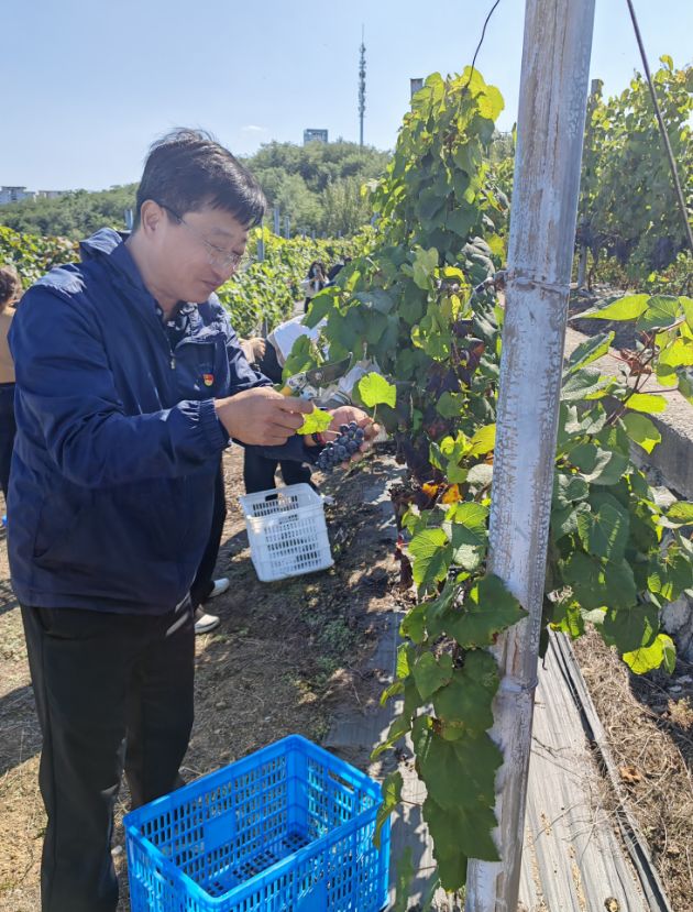 在葡萄园里,大家分工合作,有的小心地剪下葡萄串,有的负责将葡萄放入篮中。大家一边采摘,一边交流着对实践活动的感悟和体会。党徽在阳光下熠熠生辉,成为葡萄园里一道亮丽的风景线。