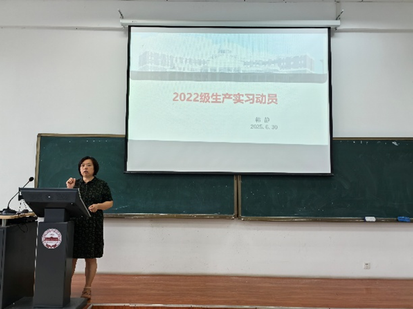 副经理韩静主持了毕业生产实习动员会,她围绕"目标导向、安全保障、任务落实、过程管理"四个方面部署工作,就行业趋势、实习任务及安全规范进行讲解,指导员工明确实习任务、做好实习准备,为实习奠定了良好基础。