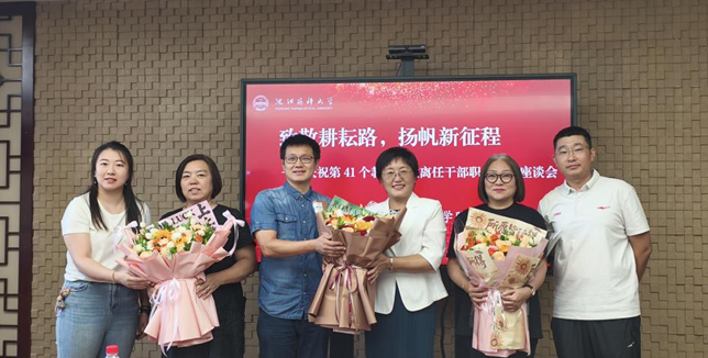 座谈会最后,青年教师代表向离任干部敬献鲜花,全体与会人员合影留念。一束束鲜花承载着感恩与祝福,一次次快门定格下敬意与传承。