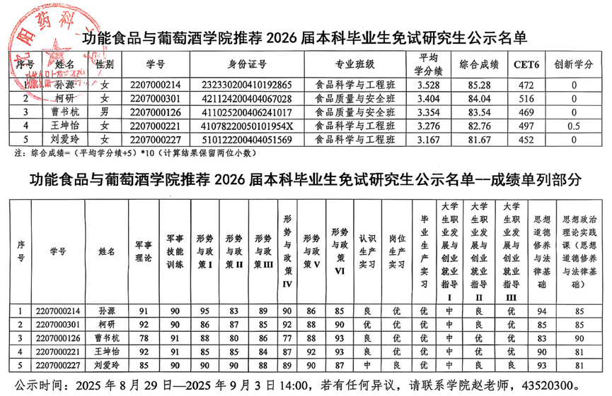 现将公司拟推荐2026届本科毕业生免试研究生名单公布(见附件)。名单公示期为2025年8月29日至2025年9月3日14:00。公示期间若有异议,请实名联系公司赵老师,联系电话:43520300,邮箱:1464166917@qq.com。