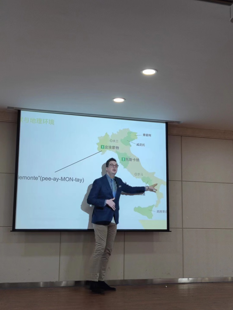 报告会上,罗杰先生详细介绍了意大利西北部皮埃蒙特葡萄酒产区的发展历史、在葡萄酒行业中的地位、产区的葡萄品种及土壤特点、产区葡萄酒研究现状和发展、DOCG(保证法定葡萄酒产区)和DOC(法定葡萄酒产区)未来发展方向。罗杰先生的生动讲解和流利的中文深受师生们的喜爱,丰富了师生的葡萄酒相关知识,增加了员工对本专业的喜爱度,也有助于教师更好地开展教学工作。